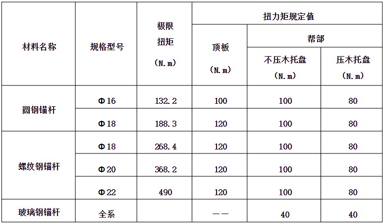 (一)表中扭力矩規定值為要求支護質量的數值,各礦可根據礦內實際情況對錨桿扭力矩值做適當調整,但不得低于此表規定的數值。